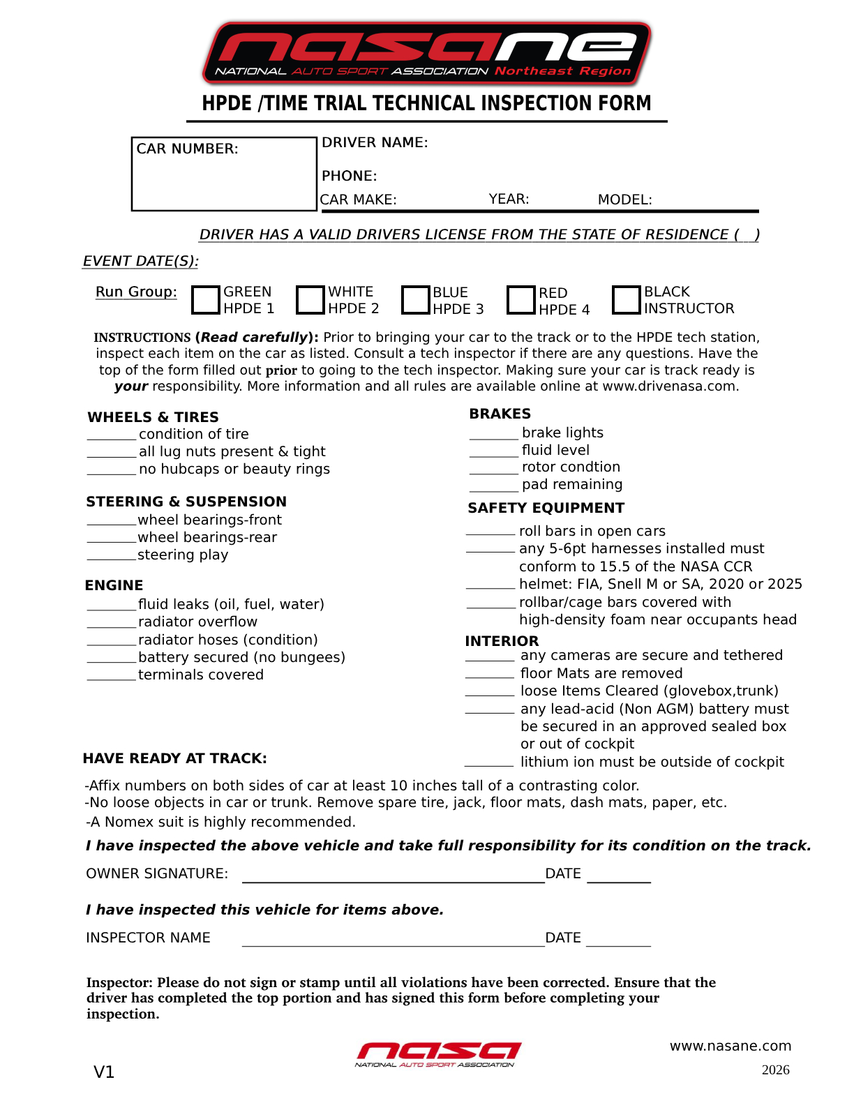 NASA HPDE Vehicle Tech Inspection Sheet